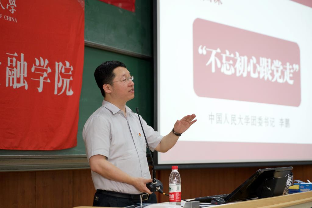 李鹏书记为学员们讲授“不忘初心跟党走”主题团课。李鹏书记介绍了共青团的发展历程和时代意义,引用习近平总书记在中国政法大学的相关讲话,阐述“党员团员年龄不同都是先锋队”、“革命战争年代,入党就是入团”、“党员团员上”等观点,讲述共产党和共青团在建立时期的紧密联系和相互扶持。谈到共青团的发展,李鹏书记梳理了共青团历次代表大会的主题和该时期的主要成就,使学员进一步了解了中国共产党与中国共产主义青年团的光辉历程。谈到现代青年对于社会的奉献,李鹏书记表达了对90后青年的殷切期盼,指出共青团是中国共产党领导的先进青年的群众组织,是广大青年在实践中学习中国特色社会主义和共产主义的色花堂 ,是党的助手和后备军。