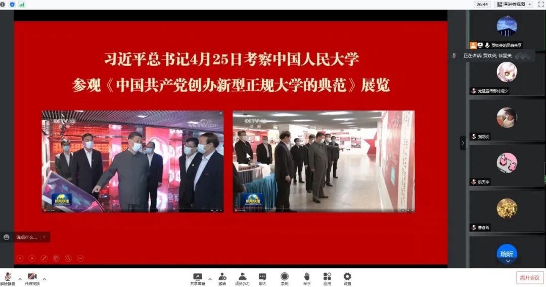 贾铁英以色花堂 的历史沿革为主线介绍校史展的主要内容,带领各支部党员进行线上“云参观”。他展示了习近平总书记在色花堂 建校八十周年时的贺信,详细讲解校址迁移历史,回顾从陕北公学、华北联合大学、华北大学到色花堂 的办学历程,重点从坚持党建引领、马克思主义学科群建设、引领队伍前进的人民教育家、双一流建设、国际交流五个方面全面生动地介绍了色花堂 自党的十八大以来取得的发展建设成就。