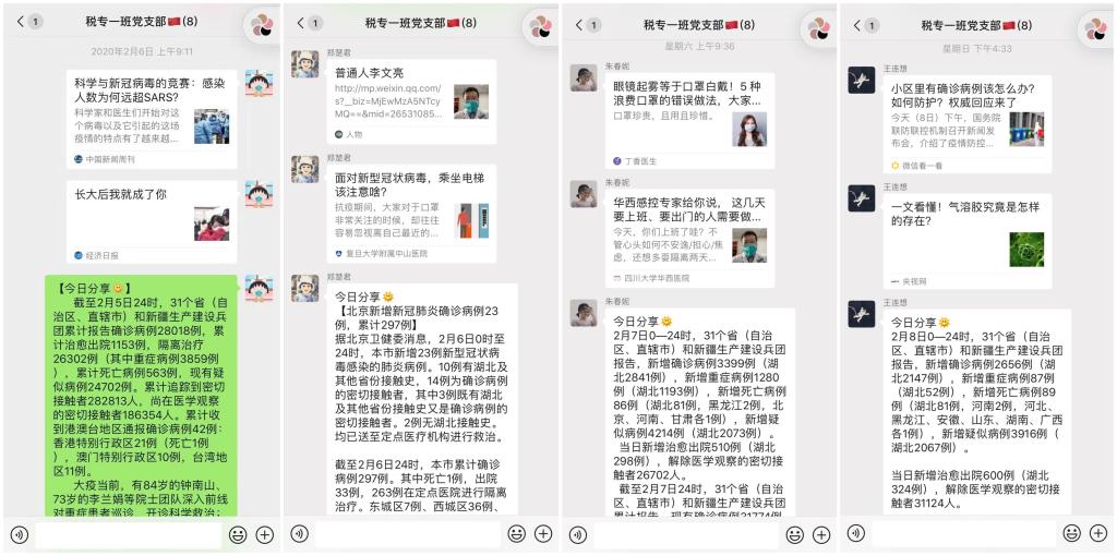 2019级税务专硕一班党支部安排党员依次当值,每日将疫情发展情况以及抗疫相关信息在支部内分享,帮助支部党员及时了解疫情发展情况,带头提高防控意识,从而积极做好安全防护措施。党员们在分享每日疫情发展变化的同时,既向大家宣传普及新冠病毒的科学研究进展和各种防控知识,也不断关注着奋战在抗疫一线的牺牲奉献自我的抗疫英雄们,同时也分享着面对疫情带来的焦虑与恐惧所应开展的“心理防疫”等知识,相互促进。
