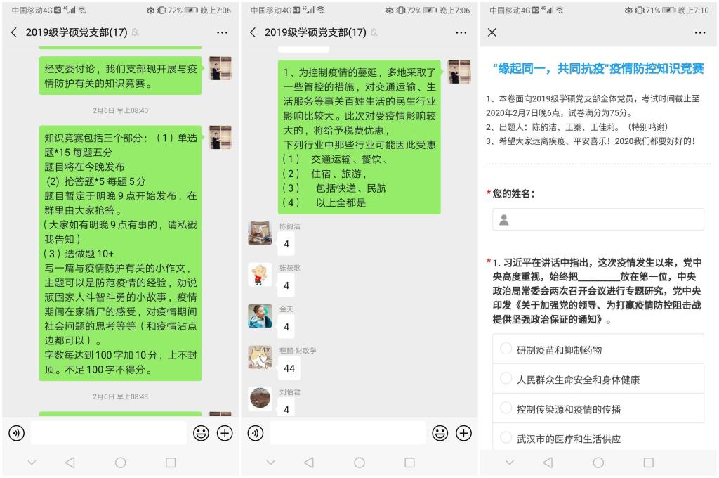 2019级学硕党支部线上主题党日活动的具体形式为与疫情防护有关的知识竞赛,知识竞赛包括三个部分:单选题、抢答题、选做题。单选题为问卷形式,共十五道。抢答题共五道,在党内微信群发布,党支部成员积极参与,气氛热烈。通过线上知识竞赛的形式,支部成员对防护新型冠状病毒有了进一步的认识,同时也进一步提高疫情期间党支部成员防范病毒的意识,为更好地向身边人宣传,不信谣不传谣打下了理论基础。