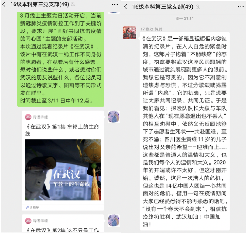 主题党日期间,多个学生党支部借助学习强国平台,在线学习“在经历中学习——疫情防控公开课”,并分享学习心得;2016级本科第三党支部等组织观看《在武汉》抗击疫情纪录片,向一线志愿者和医护人员致敬。