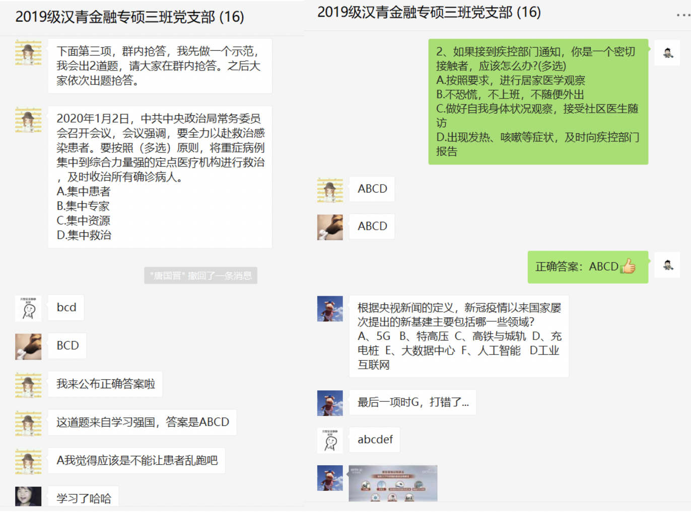 3月10日,2019级汉青金融专硕三班党支部支部书记陈嘉欣带领支部同志共同学习抗疫理论知识,分享抗疫故事,并组织了抗疫小知识抢答与手写抗疫祝福分享。这次会议中大家表现了对疫情的密切关注与对党中央政策与指导思想的充分理解。支部党员们表示,要继续发挥模范带头作用,加强抗击疫情的信心,坚决打赢新型冠状病毒感染的肺炎的防疫战。