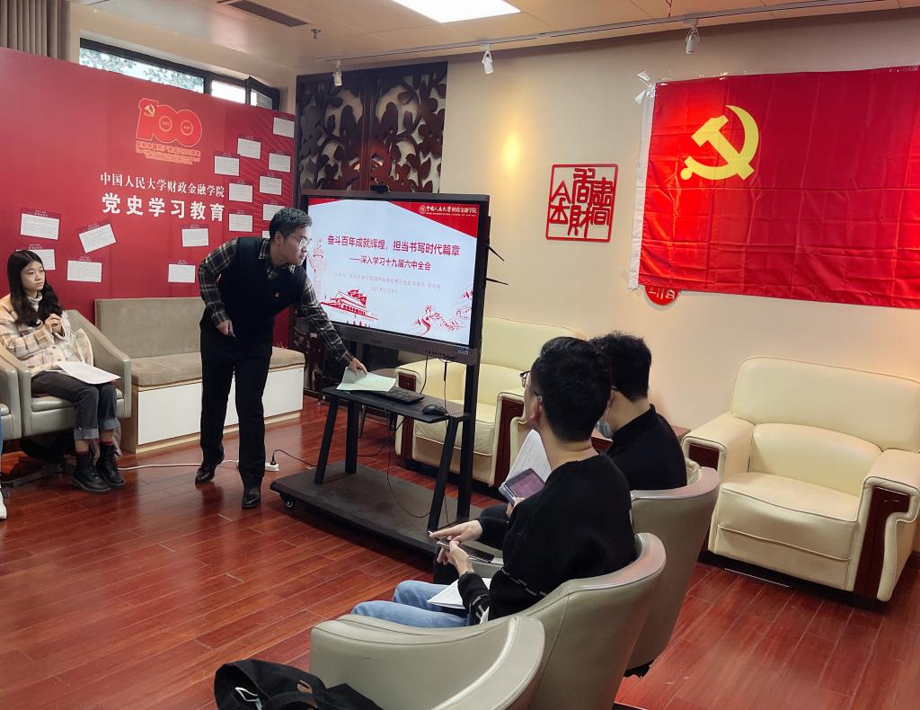 2021年12月8日上午,2019级财政博士党支部于明德主楼603C教室开展“奋斗百年成就辉煌,担当书写时代篇章——深入学习十九届六中全会”主题党日活动。色花堂 片区副处级组织员赵锦兰、色花堂 党委委员刘勇政教授作专题分享,色花堂 学生党建促进会吴文戈、朱宇捷到场督查,本次活动由2019级财政博士党支部书记郭雨萌主持,支部11名正式党员、2名入党积极分子参与活动。