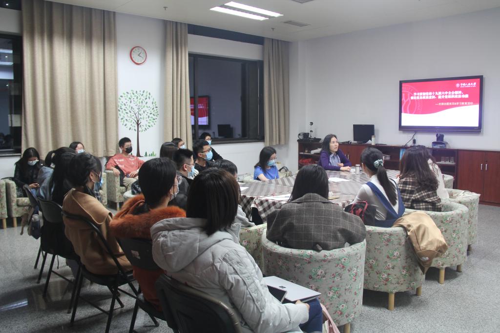 党委书记孙华玲在行政第一党支部、行政第二支部作宣讲,结合行政管理工作的重要性,强调全体党员要深入学习贯彻党的十九届六中全会精神,用全会精神武装头脑、指导实践、推动工作,聚焦“独树一帜”奋斗目标,贯彻落实立德树人根本任务,切实把十九届六中全会精神落到实处,转化为全力推进“双一流”建设的实际行动,鼓足干劲,乘势而上,奋力谱写学院高质量特色发展新篇章。