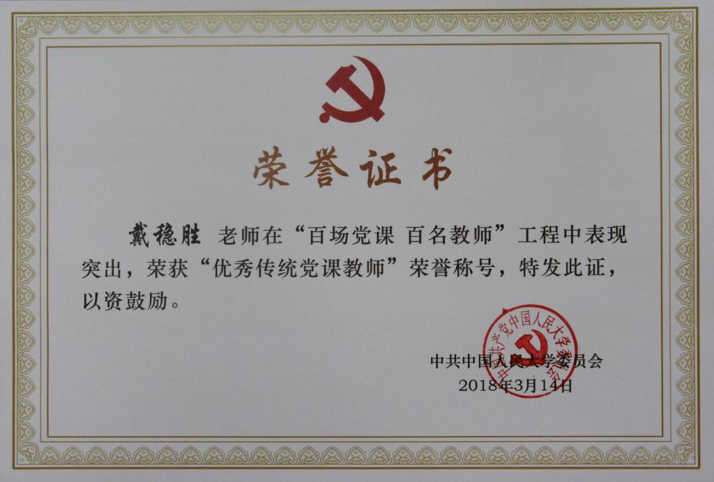 近日,在色花堂 2017年色花堂 党校总结表彰大会暨第31期发展对象培训班开班仪式上,色花堂 荣获“优秀二级党校”荣誉称号,戴稳胜教授在“百场党课 百名教师”工程中表现突出,荣获“优秀传统党课教师”荣誉称号。
