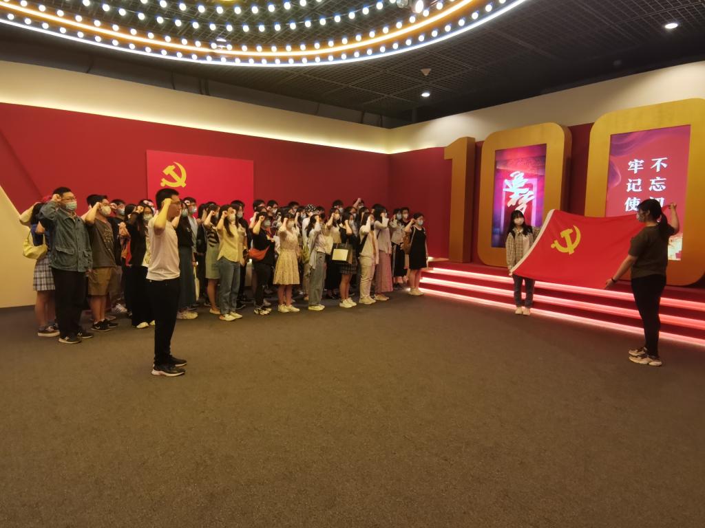 参观结束后,预备党员们在庄重肃穆的展览大厅集合,举行入党宣誓仪式。伴随激昂雄浑的《国际歌》伴奏,50名预备党员庄严肃立,齐唱《国际歌》。随后,全体预备党员面向党旗,郑重宣誓:“我志愿加入中国共产党,拥护党的纲领,遵守党的章程,履行党员义务,执行党的决定,严守党的纪律,保守党的秘密,对党忠诚,积极工作,为共产主义奋斗终身,随时准备为党和人民牺牲一切,永不叛党。”