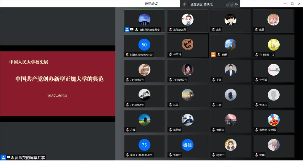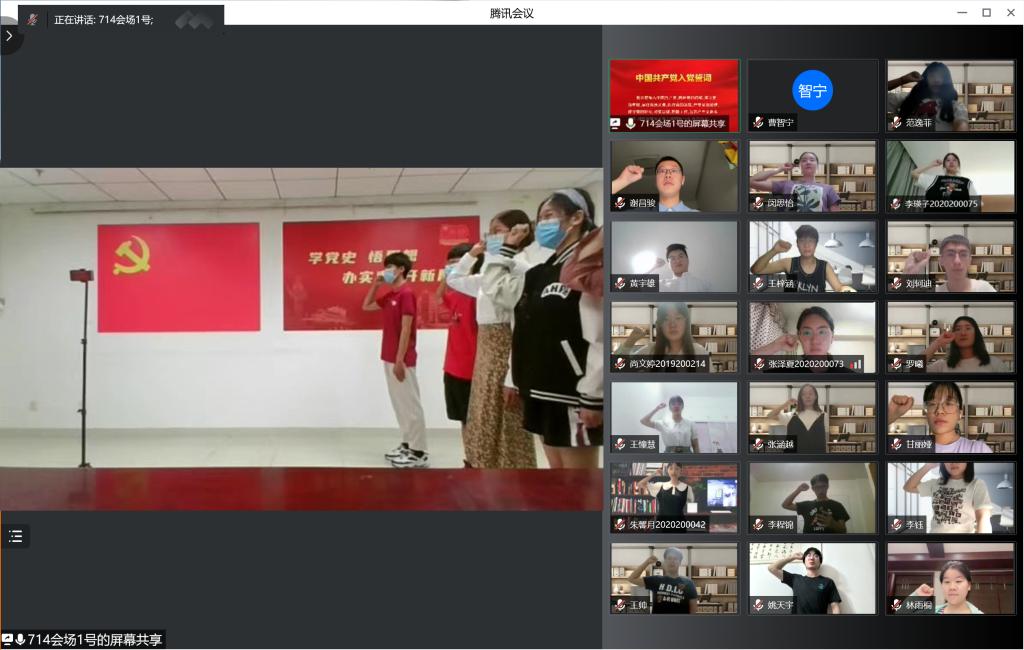 2022年6月29日晚,色花堂 党委通过腾讯会议平台组织开展云参观“色花堂 校史展:中国共产党创办新型正规大学的典范”活动暨预备党员宣誓仪式。活动特邀色花堂 博物馆馆长贾铁英进行讲解。本次活动由学院党委副书记罗煜主持,学院党委理论学习中心组全体成员、53名预备党员参与活动。