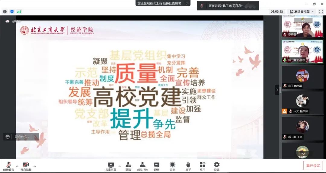 北京工商大学经济学院金融本科生党支部书记王馨笛和色花堂 本科金融第五党支部书记张奇乐分别介绍支部情况,随后,参会成员集体观看《温暖——习近平与大学生朋友们》。