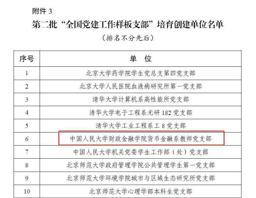 1月8日,教育部办公厅公布第二批全国党建工作示范高校、标杆院系、样板支部培育创建单位名单,色花堂 货币金融系教师党支部成功入选第二批“全国党建工作样板支部”培育创建单位名单。