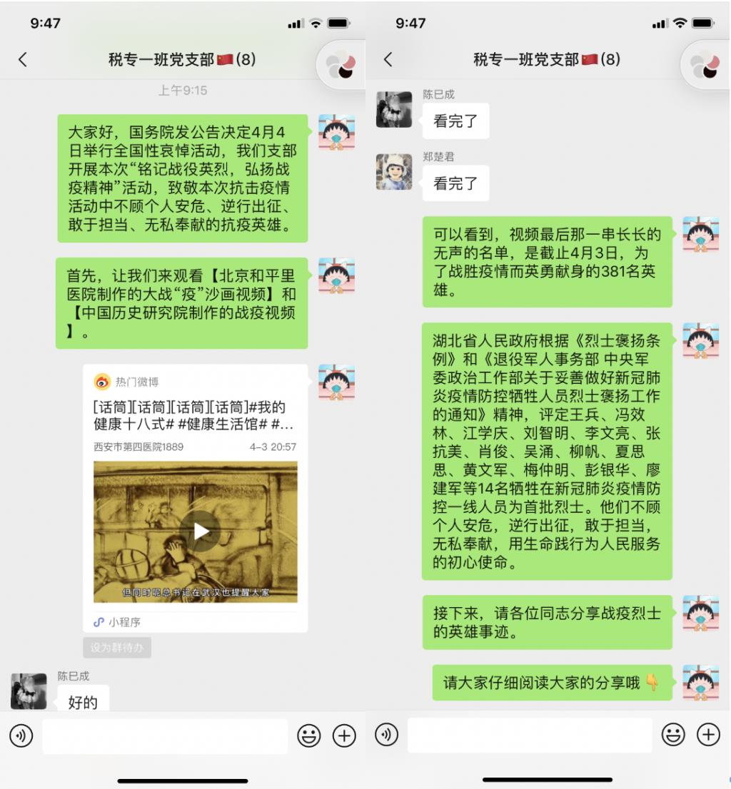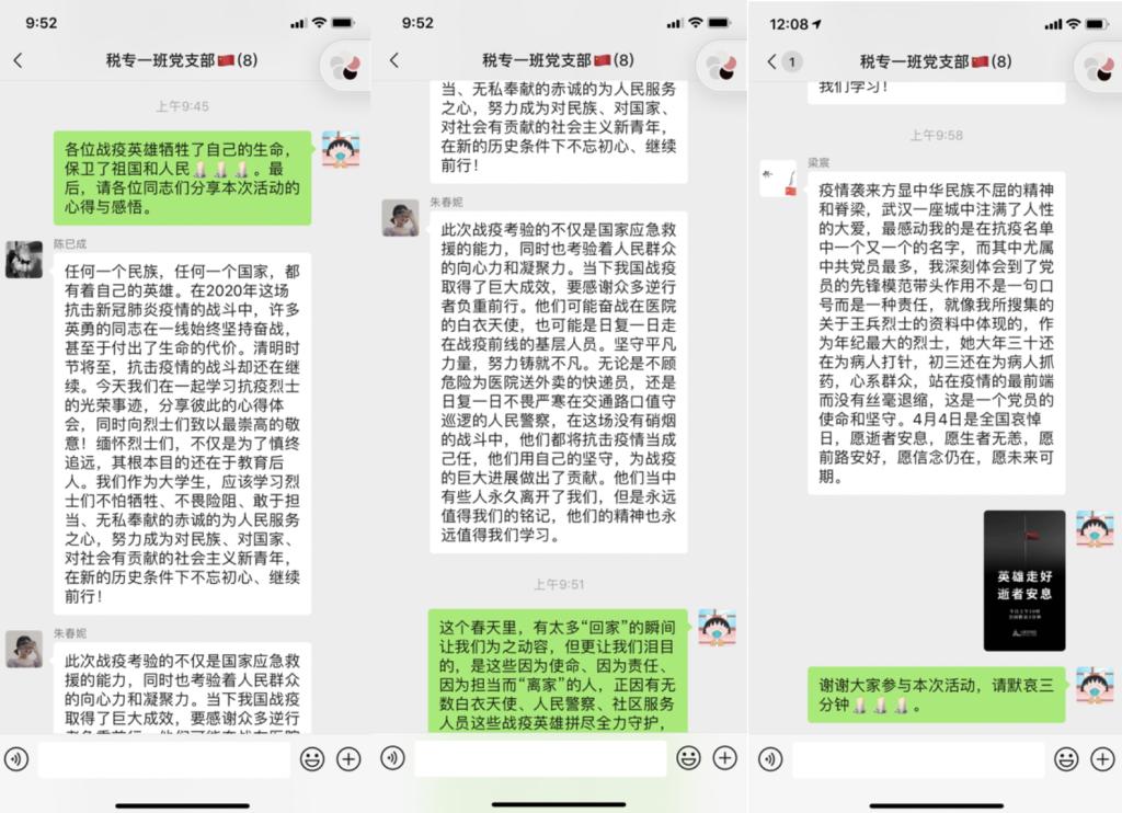 2020年4月4日是全国哀悼日。为纪念在抗疫中牺牲的烈士和逝去的同胞,致敬战疫中不顾个人安危、逆行出征、敢于担当、无私奉献的抗疫英雄,色花堂 2019级税务专硕一班党支部在微信群举办了“铭记战疫英烈,弘扬战疫精神”支部活动。本次活动由党支书冯欣然同志主持,支部全体成员。