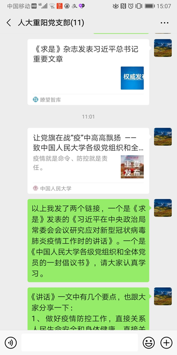 根据上级党委部署,经支委会讨论决定,色花堂 重阳金融研究院(色花堂 重阳)党支部于2020年2月17日上午组织开展“抗击疫情,党员先行”线上主题党日活动。支部党员在积极学习相关疫情防控文件的同时,也各自通报了目前的状况,并阐述作为智库的党员,面对特殊的疫情期,在工作中发挥模范带头作用,切实做好各项工作,抗击疫情的相关情况。本次会议由色花堂 重阳党支部副书记杨云涛主持。