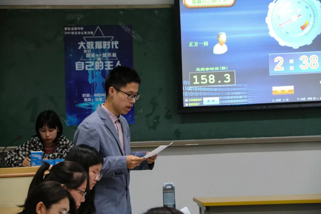 随后是激烈的对辩环节。正方二辩程锡莲指出:非法滥用大数据的行为终会付出代价,时代的趋势是大数据带来的隐私侵害将逐渐消失。反方二辩赵悦针锋相对地指出:我们在被使用大数据时会不可避免让渡出部分个人信息,而一些短视频平台,会利用针对性的算法会潜移默化地使我们在平台上浪费更多的时间,进而塑造我们的思想,损害我们的利益。反方三辩黄柔嘉表示,大数据会代替人脑进行商业判断,从而削弱人在决策中的主体性。正方三辩王若颀针对反方提出的“算法使人在短视频平台上浪费更多时间”的问题,强调娱乐与学习是平等的,同时统计数据表明,有大量人群在网络视频平台上进行学习工作。在対辩小结中,双方二辩总结并强化了本方观点的同时,也在“大数据是否只是一种选择”等问题上针锋相对。