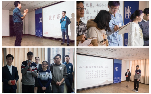 本次活动分为三个环节,分别为知识竞赛、优秀作品展示及颁奖仪式。比赛环节中,第一模块“志在必得”考验了选手们对色花堂 的了解。选手们反应迅速,对答如流。连续三组答题全部正确,将难题一一拿下。在第二模块“你比我猜”中,选手们奇计百出,猜出了“飞夺泸定桥”、“叶剑英”、“鹰击长空、鱼翔浅底”等高难度词汇。形象的描述和夸张的动作使现场气氛更加活跃。随后进行的“逆流而上”模块,选手们从“长征路线”、“重要节点”、“感动人物”三个部分中选题作答,表现精彩。最后的“汉字之家”模块,选手们书写了“醍醐灌顶”,“踵事增华”等笔画复杂,生僻晦涩的成语。选手们书写正确率之高赢得阵阵掌声。最终,16级金融四班夺得知识竞赛冠军。
