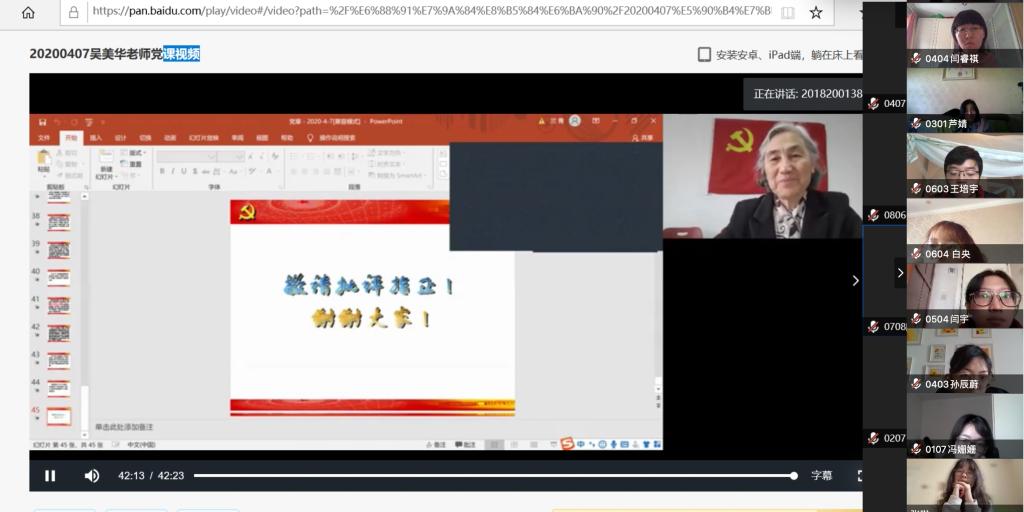 最后,吴美华教授总结道,党章作为党的根本大法,蕴涵了非常丰富的内容,包括党的奋斗目标、党的指导思想、党的纪律等,而人民至上、党的领导、战斗堡垒、党员先锋、核心价值观,这几个关键词是我们体会最深刻的。她告诉大家,只有读懂了这些,才能了解自己应该怎样在战“疫”中淬炼党性,怎样坚守初心担当使命,怎样做一个合格的共产党员。