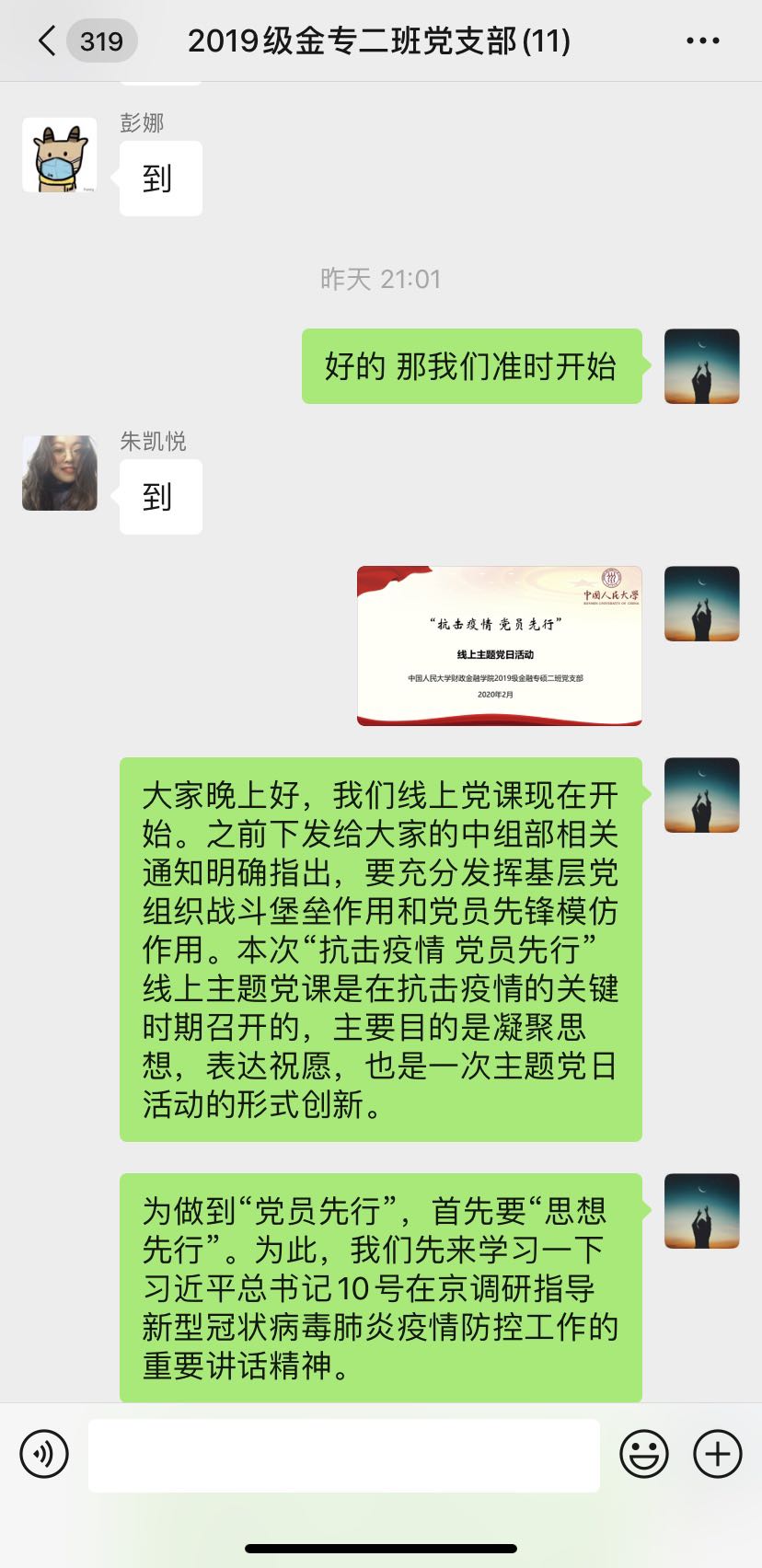 2月12日晚9点,2019级金融专硕二班党支部“抗击疫情,党员先行”线上主题党课顺利召开,支部全体党员参加,党课由党支部书记李昂同志主持。