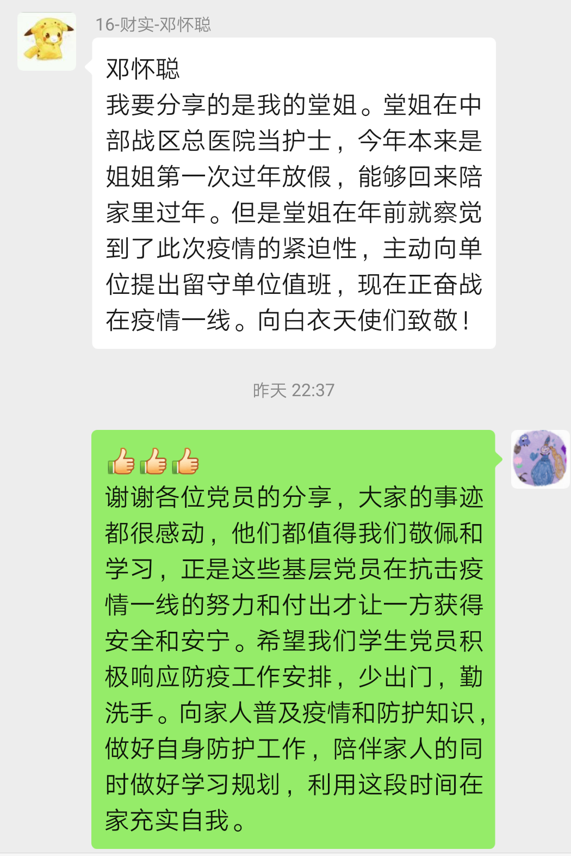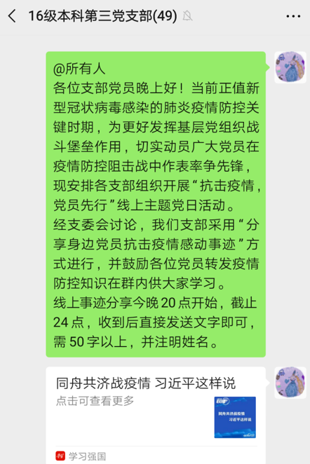 经支委会讨论,2016级本科第三党支部采用“分享身边党员抗击疫情感动事迹”方式进行,党支书兰晶晶同时鼓励支部的各位党员转发疫情防控知识在群内供大家一同学习。