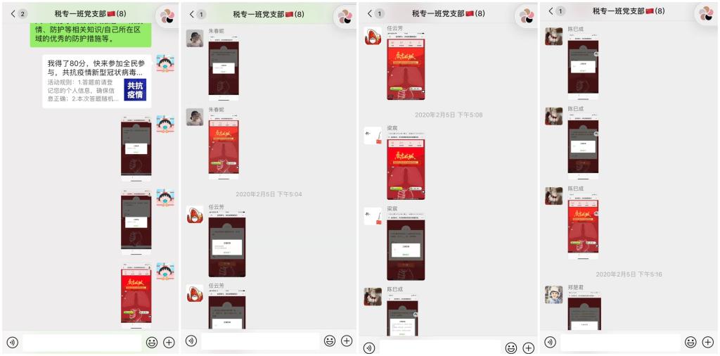 线上主题党日的第二部分为“抗疫信息每日分享”活动。本活动安排党员依次当值,每日将疫情发展情况以及抗疫相关信息在支部内分享,增进支部党员对疫情发展情况的了解掌控,带头提高防控意识,减少传播机会,从而积极做好安全防护措施,有效切断病毒的传播途径。党员们在分享每日疫情发展变化的同时,既向大家宣传普及乘坐电梯防控要点、新冠病毒的科学研究进展、气溶胶的科学解释等防控知识,也不断关注着奋战在抗疫一线的牺牲奉献自我的抗疫英雄们,同时也分享着面对疫情带来的焦虑与恐惧所应开展的“心理防疫”等知识,相互促进,并向身边的亲友等群众普及科学防疫知识。