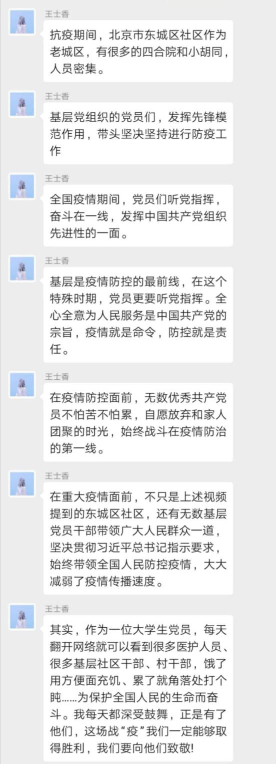 接着,潘佳程同志为大家介绍了北京市东城区党组织响应党的号召,以高度政治责任感、使命感,把疫情防控作为当前最重要工作来抓的视频材料。王士香对这段视频进行了重点点评。她认为,基层是疫情防控的最前线,在这个特殊时期,党员更要听党指挥。全心全意为人民服务是中国共产党的宗旨,疫情就是命令,防控就是责任。