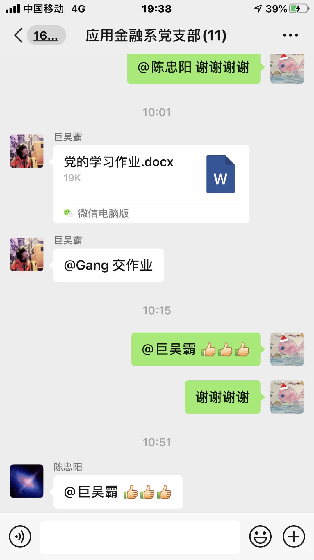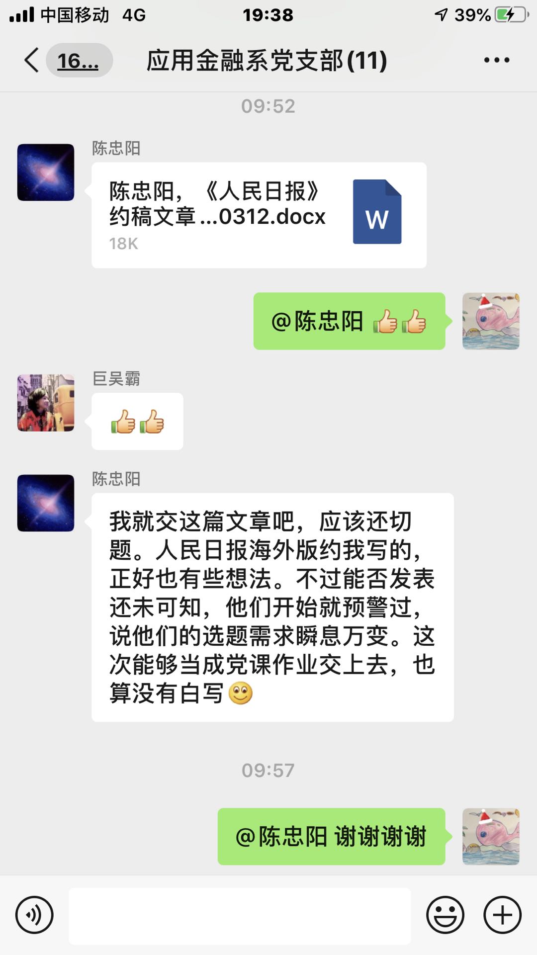 支部党员认真学习材料及学习强国相关内容后,在微信群中踊跃发言,积极讨论。教师党员们结合自身专业特长,在相关领域就抗疫经验和现阶段经济恢复工作做出了深入分析。吴晶妹建议地方成立“政务诚信监督调查委员会”,陈忠阳认为应该推动风险管理与国家管理制度现代化建设。