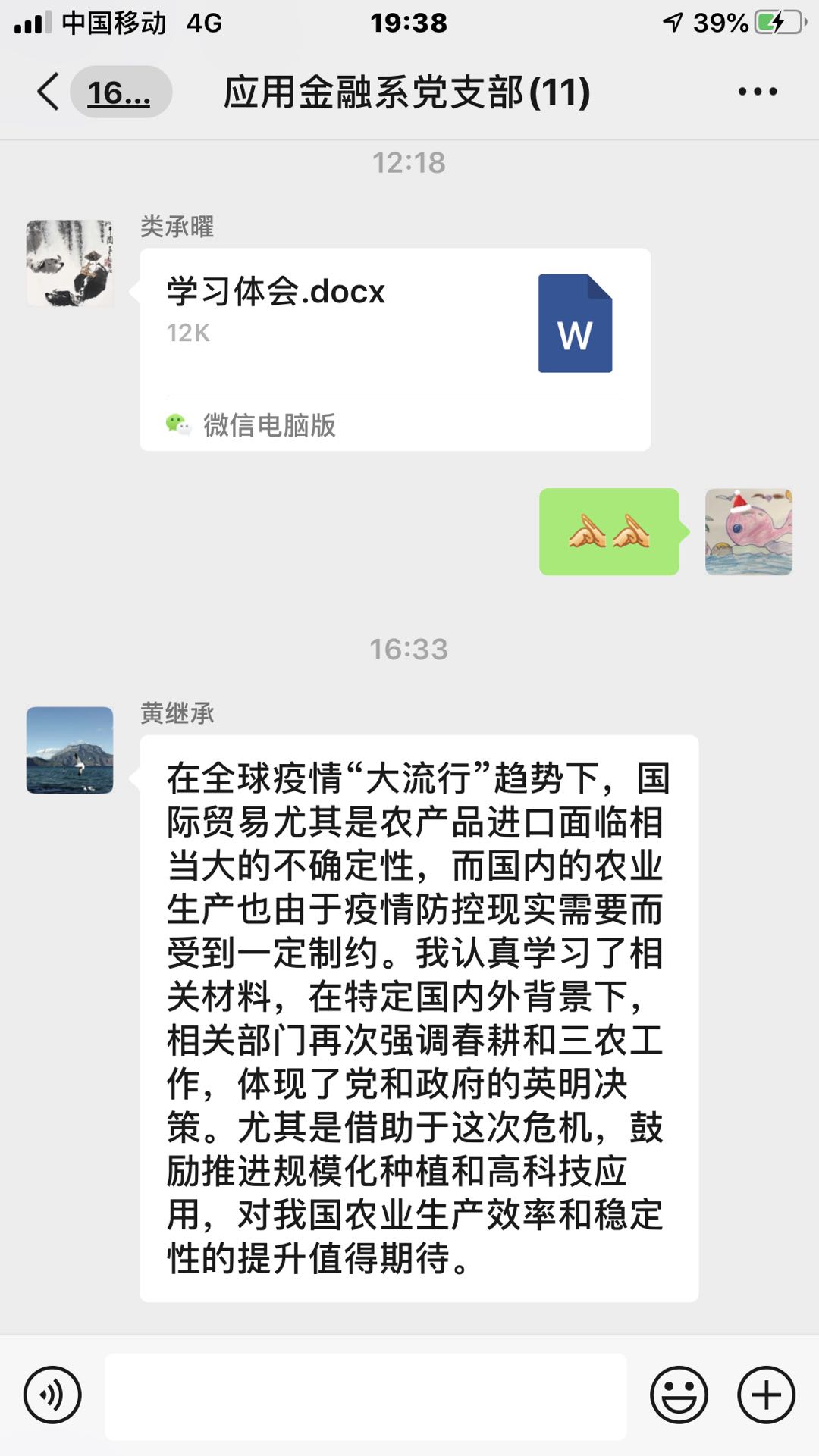 通过本次线上学习讨论,应用金融系教师党支部各位成员加深了对当前疫情发展情况的了解,对当前国内经济形势有了更深刻的认识。本次活动后,支部全体党员将进一步坚定战“疫”信心,凝聚抗疫力量,画好共同抗击疫情的同心圆。