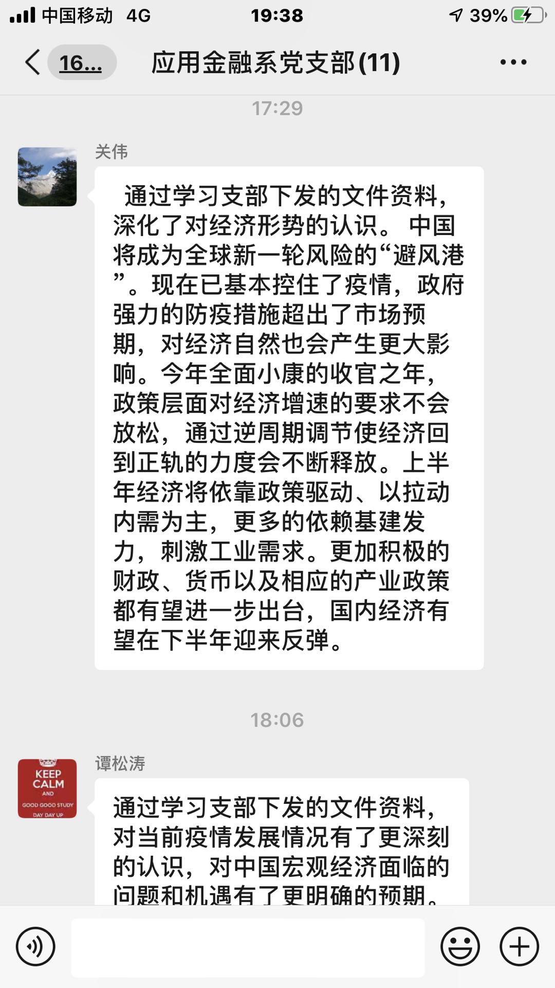 线上主题党日|应用金融系教师党支部学习讨论抗疫经验,深刻分析经济形势