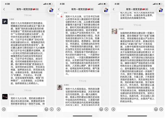 2020年4月19日,为深入贯彻落实习近平新时代中国特色社会主义思想和党的十九大精神,切实加强党的政治建设,色花堂 2019级税务专硕一班党支部在微信群举办“加强基层党组织政治建设”线上主题党日活动。本次活动由2019级税务专硕一班党支部书记冯欣然主持,支部全体成员参加。