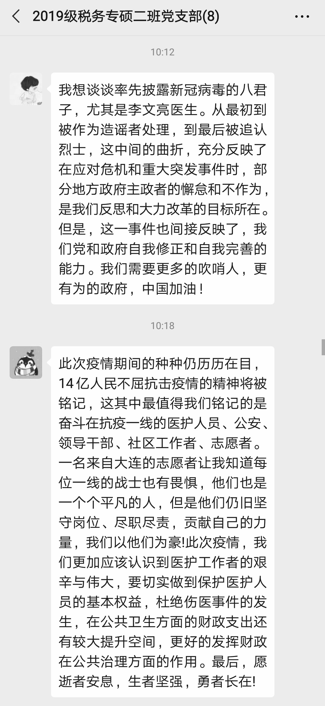 2020年4月3日,国务院发布公告,宣布4月4日举行全国性哀悼活动:在此期间,全国和驻外使领馆下半旗志哀,全国停止公共娱乐活动。4月4日上午10时,2019级税务专硕二班党支部通过微信群等平台召开了“清明追思,缅怀同胞”主题悼念活动。活动由党支部书记马国焕同志主持,表达了对抗击新冠肺炎疫情斗争牺牲烈士和逝世同胞的深切哀悼。