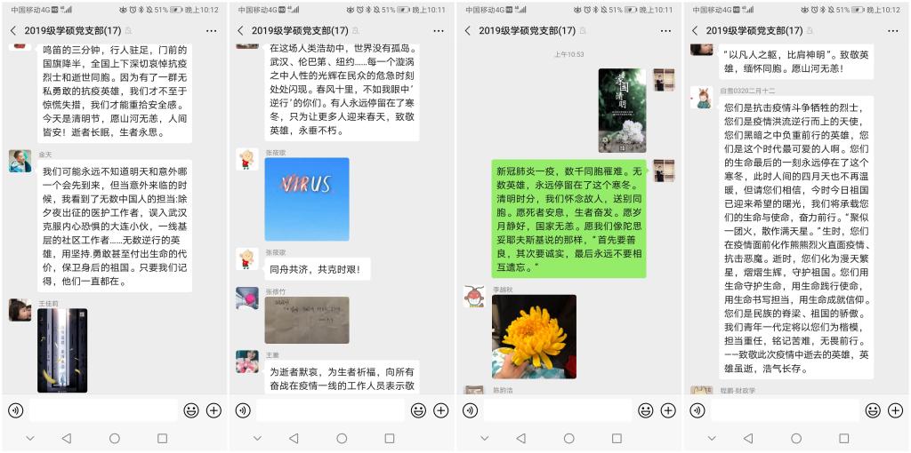 线上哀悼活动开始后,党员同志们纷纷将自己的感悟发在群中。王蓁同志写道:为逝者默哀,为生者祈福,向所有奋战在疫情一线的工作人员表示敬意,为团结的人民群众加油。愿众志成城,共迎春来;王论意同志表示,新冠肺炎一疫,数千同胞罹难。无数英雄,永远停留在了这个寒冬。清明时分,我们怀念故人,送别同胞。愿死者安息,生者奋发。愿岁月静好,山河无恙;陈韵洁同志则写道,在这场人类浩劫中,世界没有孤岛。武汉、伦巴第、纽约……每一个漩涡之中人性的光辉在民众的危急时刻处处闪现。春风十里,不如 “逆行”的你们。有人永远停留在了寒冬,只为让更多人迎来春天,致敬英雄,永垂不朽。