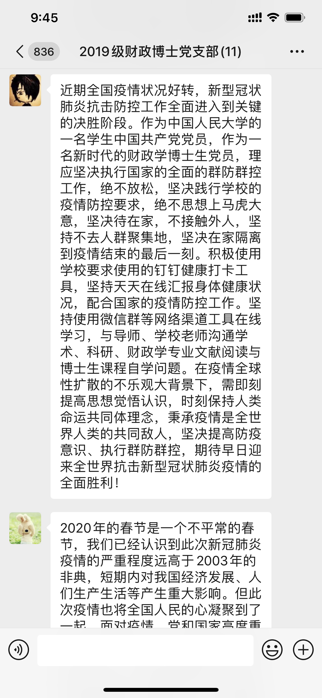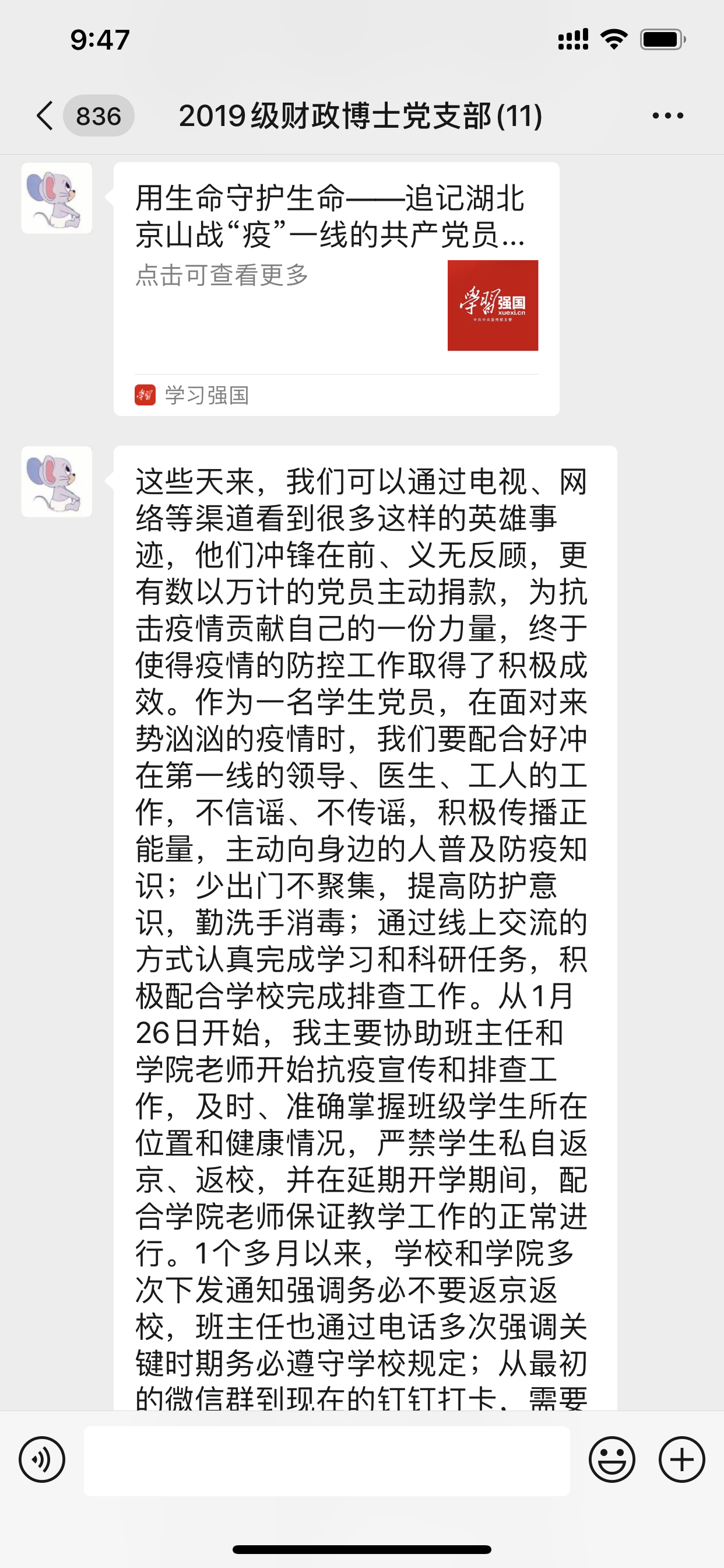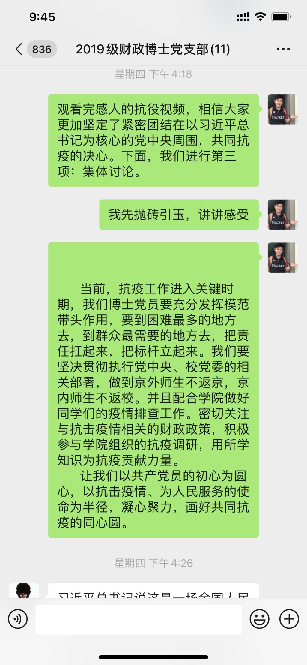 2020年3月5日下午4点,2019级财政博士党支部在支部微信群召开了本年度第二次线上会议。本次会议由党支部书记郭雨萌主持,全体成员参与。时值巩固抗击新型冠状病毒疫情的关键时期,全体党员在线上积极交流,充分发挥战斗堡垒作用和先锋模范作用,巩固深化了“不忘初心、牢记使命”主题教育成果。