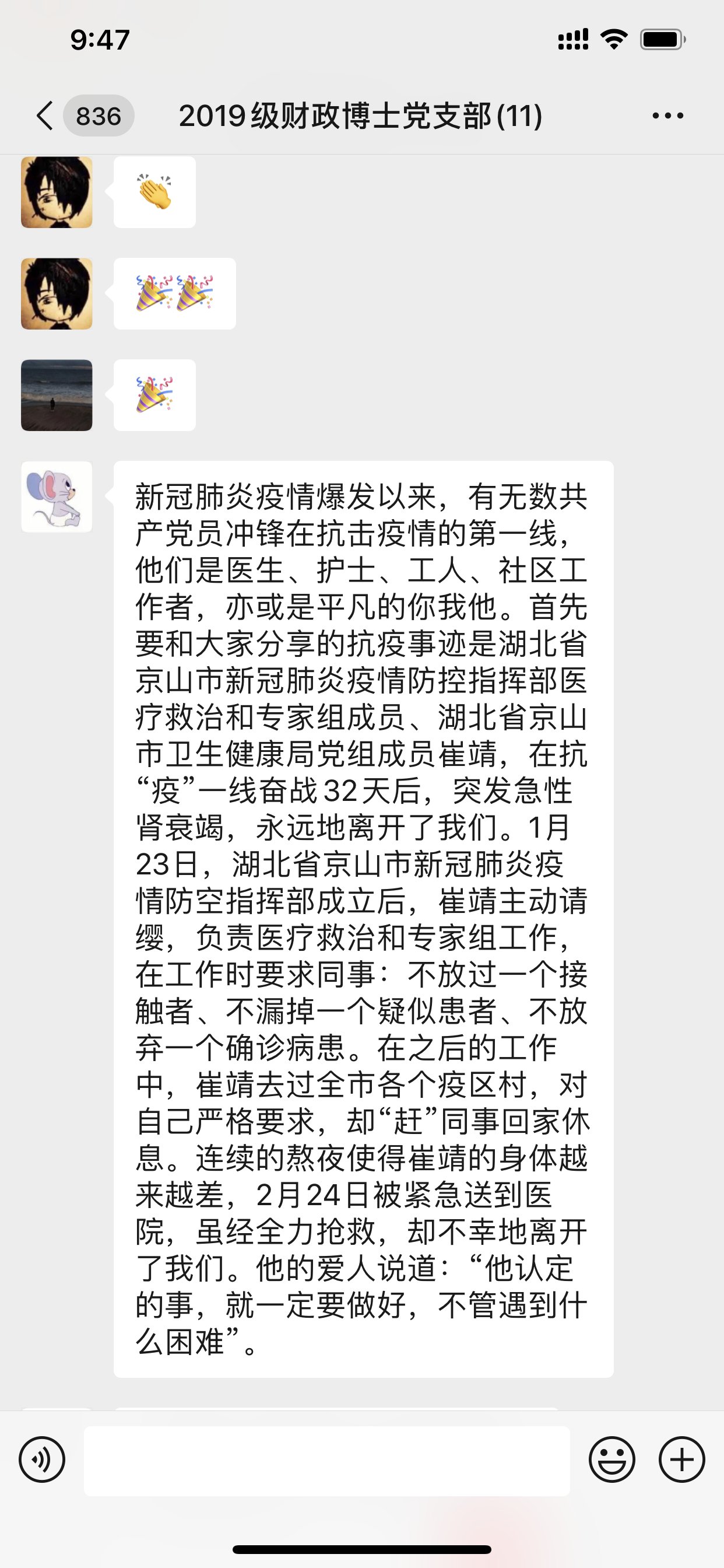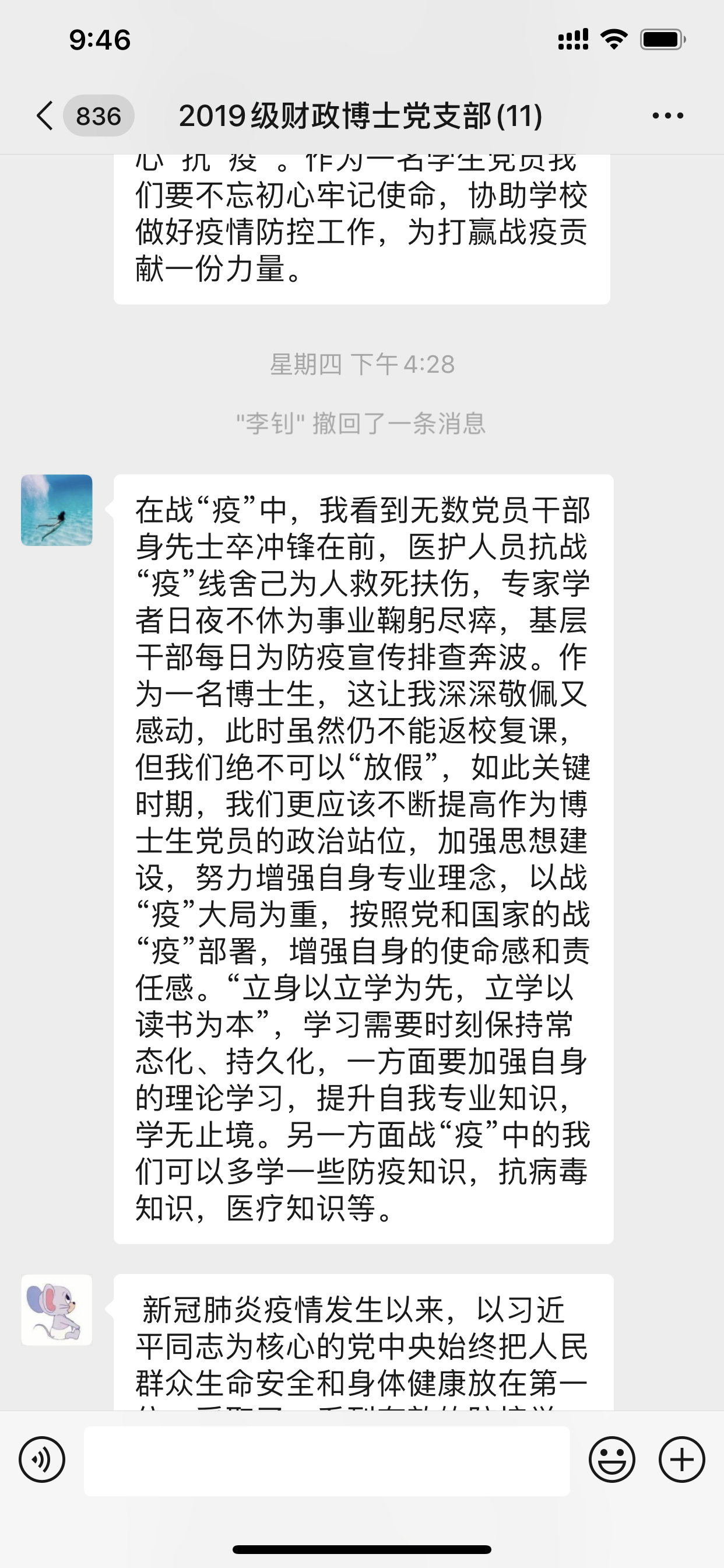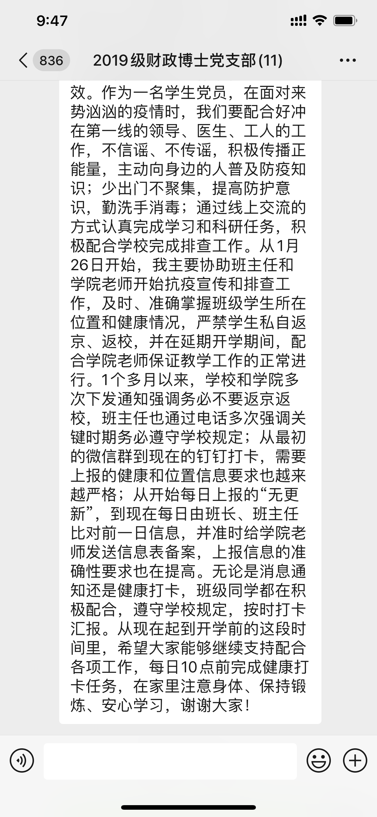2020年3月5日下午4点,2019级财政博士党支部在支部微信群召开了本年度第二次线上会议。本次会议由党支部书记郭雨萌主持,全体成员参与。时值巩固抗击新型冠状病毒疫情的关键时期,全体党员在线上积极交流,充分发挥战斗堡垒作用和先锋模范作用,巩固深化了“不忘初心、牢记使命”主题教育成果。