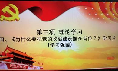 第三项观看学习视频——《为什么要把党的政治建设摆在首位》。观看后同志们也更加清楚了管党治党不仅关系党的前途命运,更关系着国家和民族的前途命运。党的十九大站在新的历史起点上,号召全党必须毫不动摇把党建设得更加坚强有力。