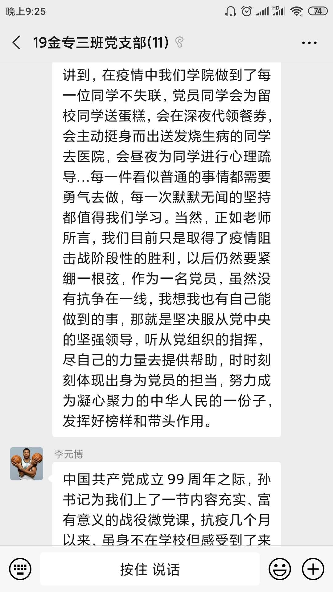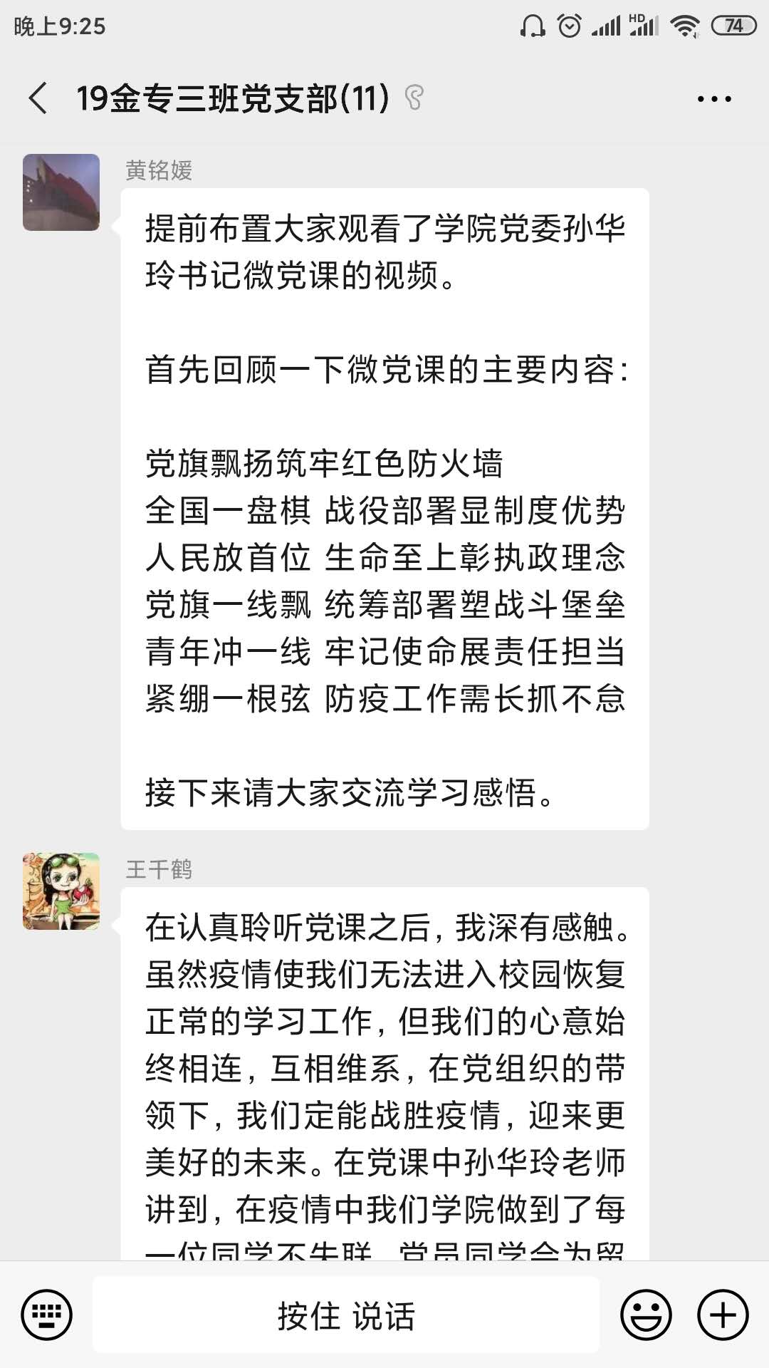 2020年7月1日是党的99岁生日,学院党委书记孙华玲老师为大家录制了以“党旗飘扬筑牢红色防火墙”为主题的微党课,本次主题党日活动将孙老师的微党课作为学习材料,支部各位成员先自行观看微党课,再集中讨论交流。晚上7点,支部成员准时上线,分享自己的学习心得。2020年年初,新冠肺炎疫情爆发,在这次疫情攻坚战中,党和国家时刻将人民放在第一位,以人民的生命安全为首要任务。同时,党中央坚持走群众路线的优势也在此时尽显,正是因为时刻谨记“为了人民”,才能在关键时刻“依靠人民”,在全国人民的努力下,抗疫战争取得了阶段性的胜利。在因为疫情无法返校的半年时间里,色花堂 学院通过各种方式保证所有师生正常的工作、学习,用线上活动的方式让党员同志能紧紧围绕在党组织身边。
