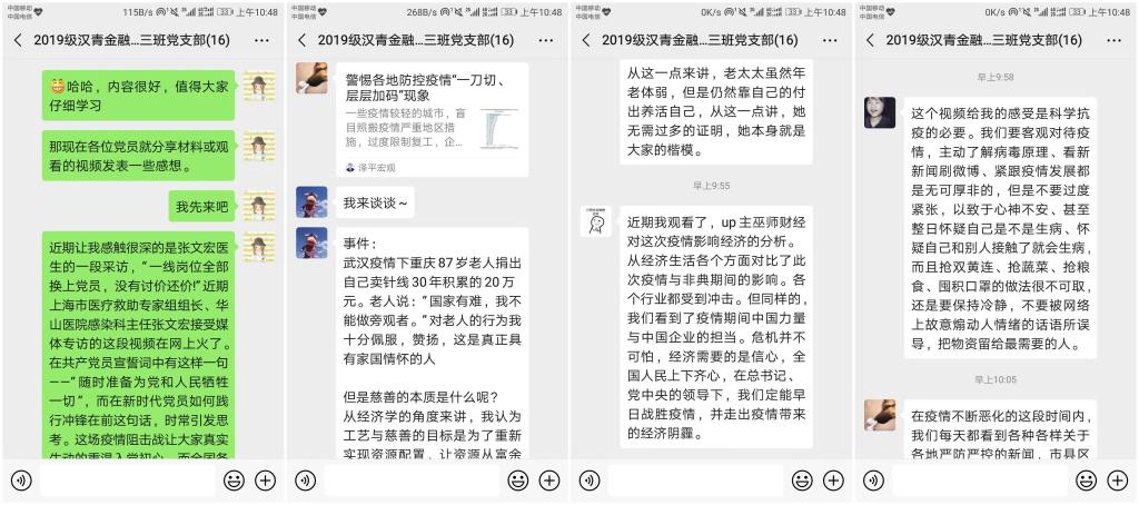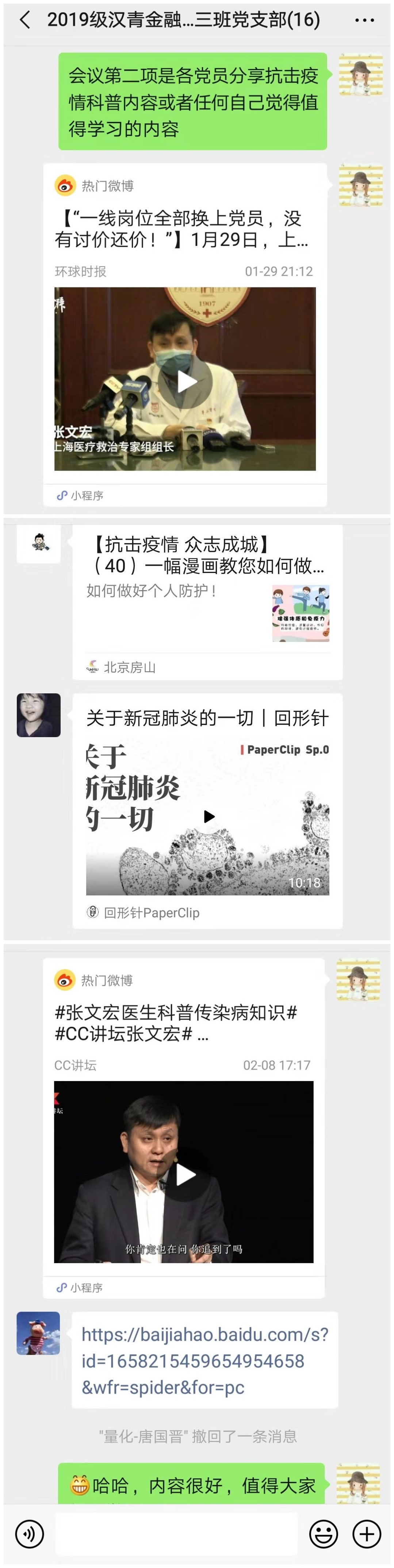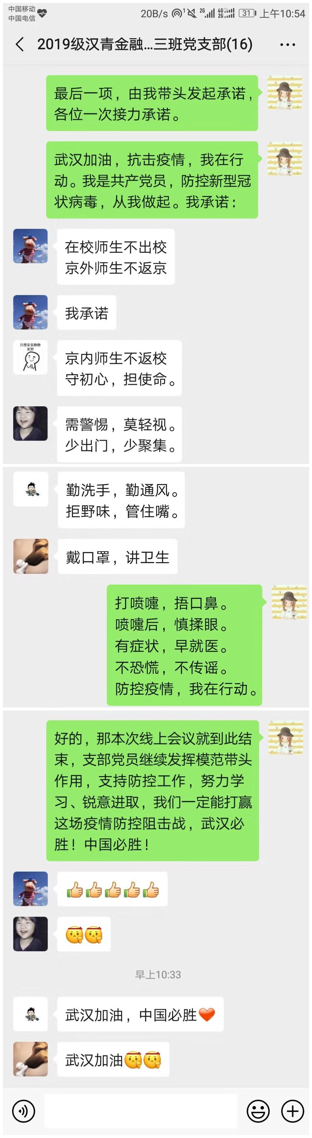 2020年2月12日晚,2019级汉青金融专硕三班党支部响应学院党委号召,在支部微信群组织开展了“抗击疫情,党员先行”线上主题党日活动。本次线上会议由陈嘉欣书记主持,全体党支部同志积极参与。