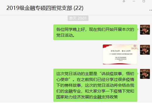 7月15日晚8点,2019级金融专硕四班党支部以微信群聊的方式开展“讲战疫故事,悟初心使命——谈谈疫情下党和国家助力经济发展的金融支持政策”党日活动,活动由党支部书记梁卓敏主持,支部全体党员和积极分子参与了本次活动。