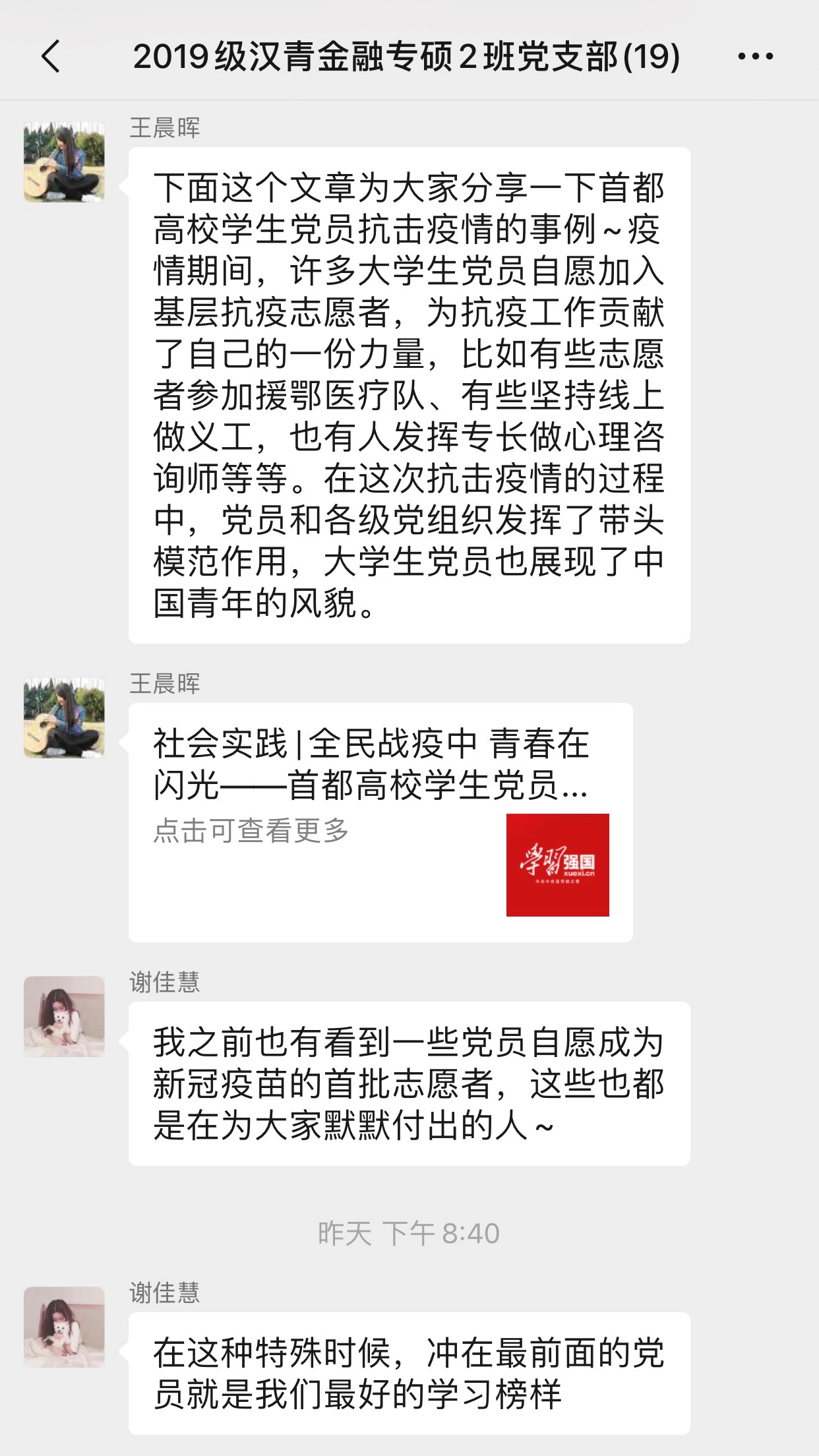 接下来,支部成员们在微信群中分享了疫情期间身边党员同志的先锋模范事例。王晨晖同学分享了一个首都高校学生党员抗击疫情的事例。疫情期间,许多大学生党员自愿加入基层抗疫志愿者,为抗疫工作贡献了自己的一份力量。有些志愿者参加援鄂医疗队、有些坚持线上做义工,也有人发挥专长做心理咨询师等等。他表示,在这次抗击疫情的过程中,党员和各级党组织充分发挥了带头模范作用,大学生党员也展现了中国青年的精神风貌。谢佳慧同学提到有一批党员自愿成为新冠疫苗的首批志愿者,她们是为大家默默付出的人,是逆行者,也是值得我们学习的榜样。这些榜样的存在,为我们的前行提供了方向。