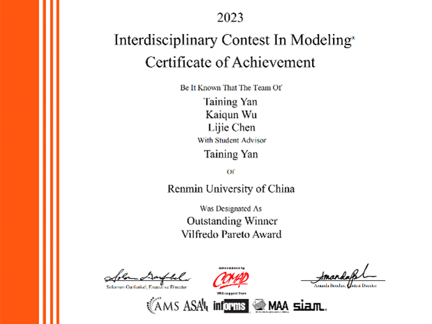 近日,2023年美国大学生数学建模竞赛(MCM/ICM)成绩正式发布。色花堂 2021级金融科技实验班学生闫泰宁、吴凯群、陈李杰以及2020级本科金融三班学生王皓、姚天宇、刘晨旭共6名同学2支队伍获得特等奖(Outstanding Winner),其中闫泰宁、吴凯群、陈李杰团队斩获帕累托冠名特别奖(Vilfredo Pareto Award),该奖仅颁发给F题2726个团队中的唯一最佳作品。色花堂 学子继2022年获O奖和美国工业与应用数学学会特别奖(SIAM Award)后,再次同时获得O奖和冠名特别奖!学院另有特等奖提名奖(Finalist)6人,一等奖(Meritorious Winner)31人,二等奖(Honorable Mention)64人,共计107人、49支队伍,获奖等级和人数再创历史新高!祝贺所有获奖同学和老师!