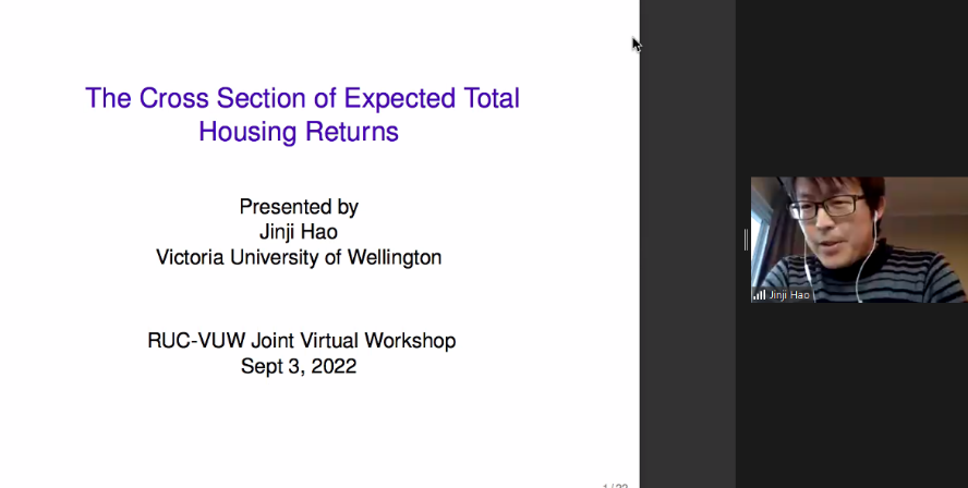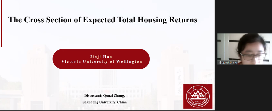 下午会议的第一部分。来自惠灵顿维多利亚大学的Jinji Hao、中欧国际工商学院的单宏宇分享了论文。Jinji Hao题为The Cross-Section of Expected Total Housing Returns的文章研究了预期住房总收益的截面决定因素,发现了显著的价值效应、动量效应和逆转效应。山东大学的张群姿点评了这篇论文。单宏宇题为Up or Out:Markup,Growth and Startup Valuation的文章研究了企业如何在盈利能力、增长和估值等战略目标中平衡,讨论了使得企业估值接近其盈利能力的条件。圣加仑大学的Vesa Pursiainen点评了这篇文章。