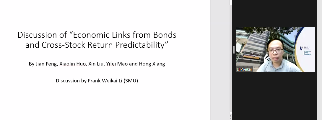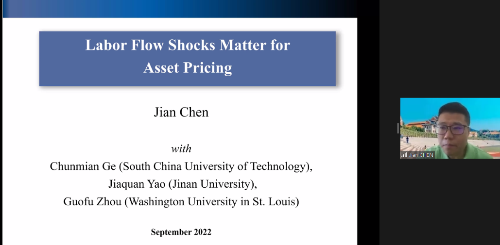 上午会议的第一部分。来自约翰斯霍普金斯大学的Yinan Su、康奈尔大学的Yifei Mao展示了论文。Yinan Su题为Flow-Based Asset Pricing: Maximum Price Impact Ratio的文章发现非信息流的价格影响作为边际投资者的风险补偿而产生,在给定的基本风险水平下,做空能产生最大价格影响的投资组合是最有效的反流动交易策略。伦敦政经学院的Thummim Cho对这篇论文进行了点评。Yifei Mao题为Resurrecting Dead Capital: The Sharing Economy, Entrepreneurship, and Job Creation的文章以爱彼迎的渗透程度作为共享经济和风险资本发展的代理变量,发现爱彼迎对当地企业的创建具有刺激作用,为研究共享经济的实际影响提供了新的视角。岭南大学的Lai Wei对这篇文章进行了点评。