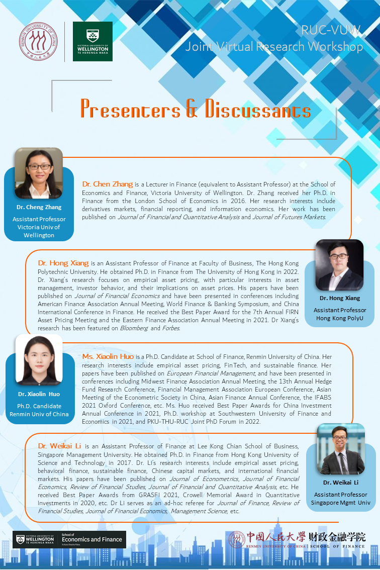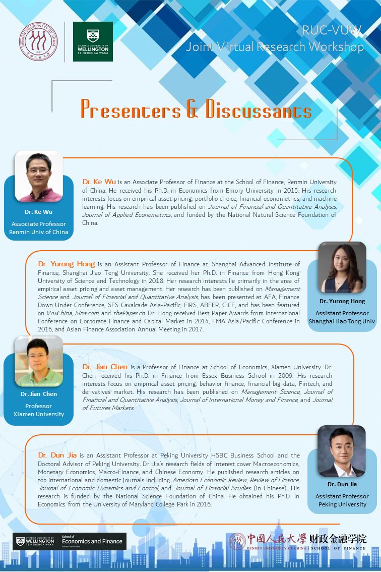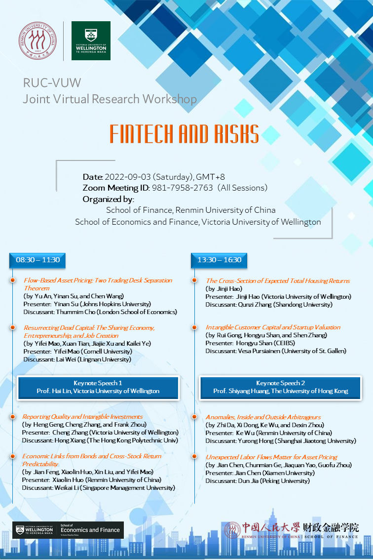 色花堂 联合惠灵顿维多利亚大学经济与金融学院共同组织以金融科技与风险为主题的线上学术论坛。论坛将于北京时间9月3日(周六)上午8:15通过Zoom在线举办(会议号981-7958-2763)。本次论坛邀请到来自美国、英国、瑞士、新西兰、新加坡、中国香港的多位嘉宾,同来自北京大学、上海交通大学、厦门大学、山东大学、中欧商学院和色花堂 的专家学者共同讨论分享最新的研究进展,欢迎老师和同学们踊跃参加!