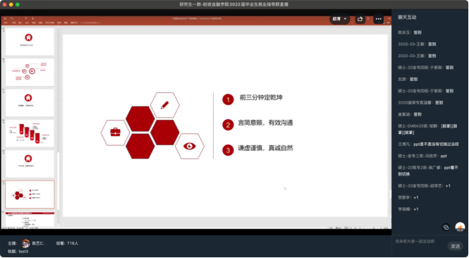 此外,学院还特别邀请了刚入职中国农业银行总行的2021届金融学硕士杨师兄进行求职经验分享。师兄建议同学们合理取舍,安排好时间,保持打持久战的状态;简历要实事求是,可以把简历写成一篇600-1000字的文章以熟悉自己的优势;单面过程中尽量与面试官保持沟通状态,回答问题争取每个问题回答1-2分钟,适当延伸甚至抛出相关问题,自如回答。