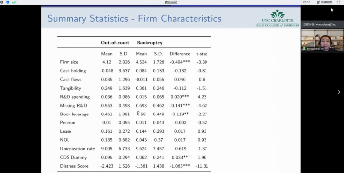 本次褚勇强教授分享的文章研究角度新颖,首次为投贷联动对公司的影响提供了实证证据,同时也极大程度丰富了目前已有的关于公司财务困境研究的理论。他首先从企业在面对传统财务困境时传统的破产和庭外债务重组的比较出发,引出了债权人和股东之间的利益冲突、公司协同效应、信息不对称和监管等问题,随后着重讨论债权人和股东之间的利益冲突。褚勇强教授详细介绍了所选取的数据指标,从如何选取和界定处于财务困境的公司、如何选取已经经历破产或债务重整的公司到如何选取存在投贷联动情况的公司,褚勇强教授的研究思路和方法层层展开。