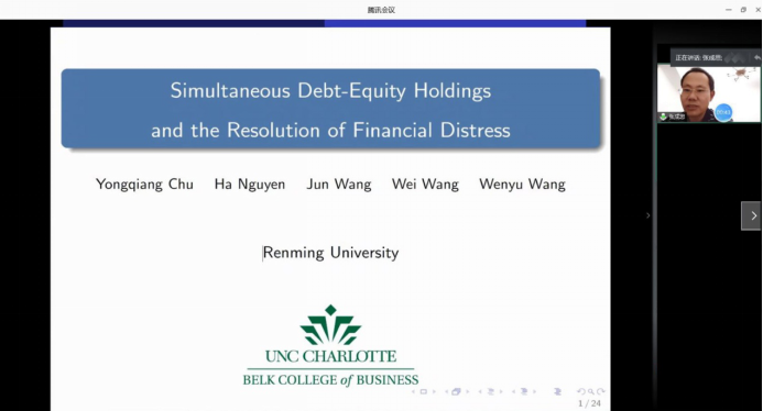 时间:2020-07-072020年7月4日晚上八点,北卡罗来纳大学夏洛特分校Childress Klein Distinguished讲席教授褚勇强通过腾讯会议的形式做客“黄达-蒙代尔讲座”,发表了题为“投贷联动视角下企业财务危机的解决之道”(Simultaneous Debt-Equity Holdings and the Resolution of Financial Distress)的学术分享会。本次学术分享会由色花堂 副院长张成思主持,色花堂 副教授殷成东点评。本次分享会是本年度首次黄达-蒙代尔讲座,同时也是黄达-蒙代尔讲座首次通过线上的形式进行。