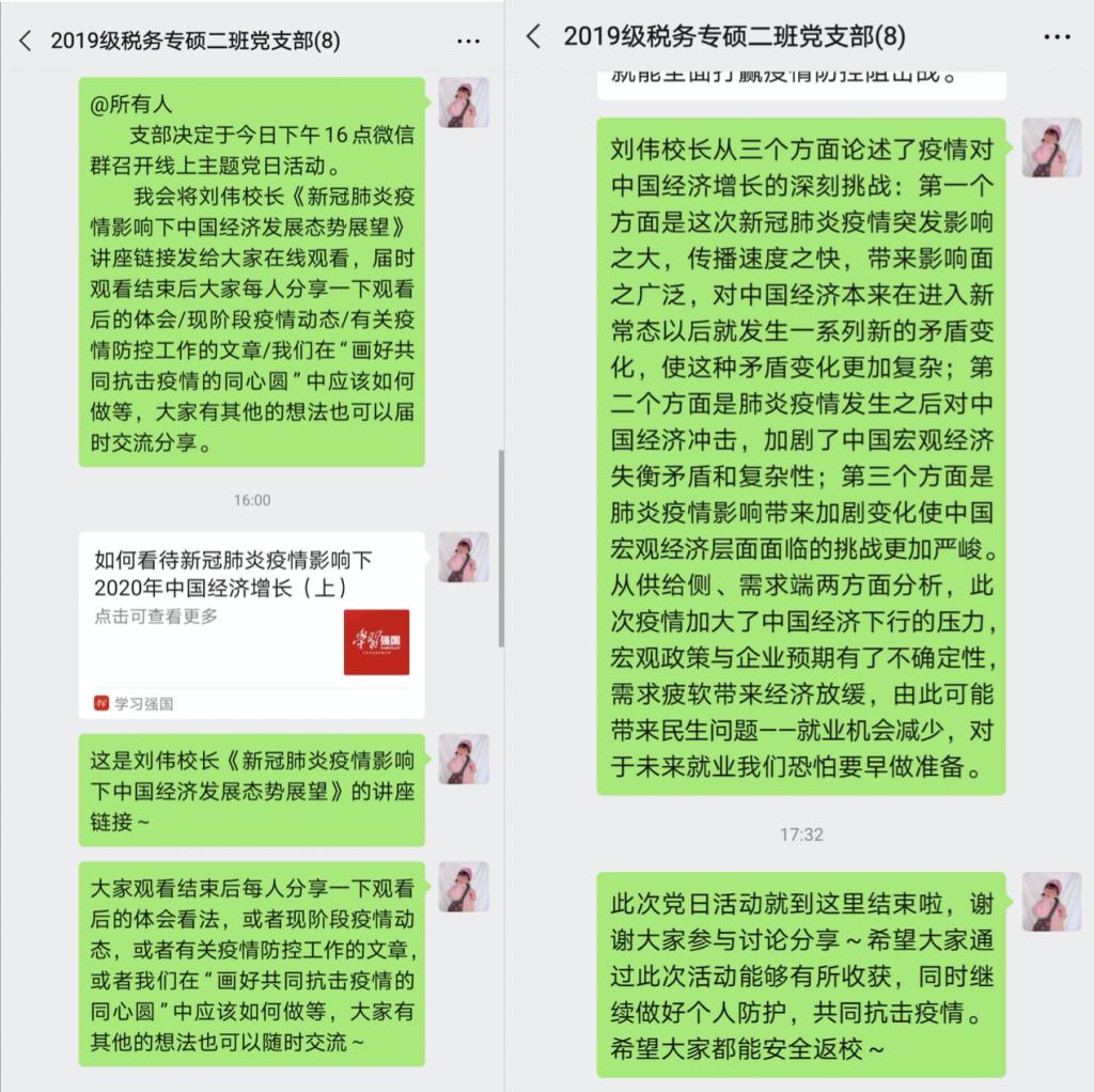 3月8日下午,2019级税务专硕二班党支部开展了“画好抗击疫情的同心圆”线上主题党日活动。支部党员学习了刘伟校长主讲的《如何看待新冠肺炎疫情影响下2020年中国经济增长》疫情防控公开课,并纷纷表达了对于此次疫情的看法。本次活动使得支部党员们对“此次疫情对中国经济的影响”有了进一步的了解,并表示应对未来就业早做准备,同时在抗击疫情工作中发挥支部党员的先锋模范作用,做到“在校不出校、京外不返京、京内不返校”。