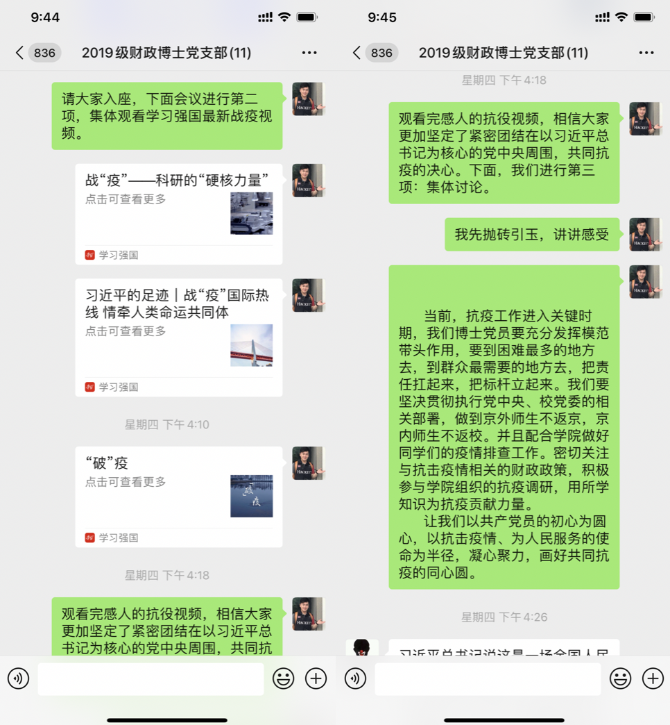 3月5日下午,2019级财政博士党支部书记郭雨萌组织支部成员集体观看了学习强国抗击疫情宣传片三条战疫最新视频,并带领大家就如何为抗击疫情作出贡献进行了深入的交流分享,最后以知识测试的形式巩固疫情防控知识。会议结束后,全体党员同志表示:凝心聚力,画好共同抗击疫情的同心圆,武汉加油!中国加油!
