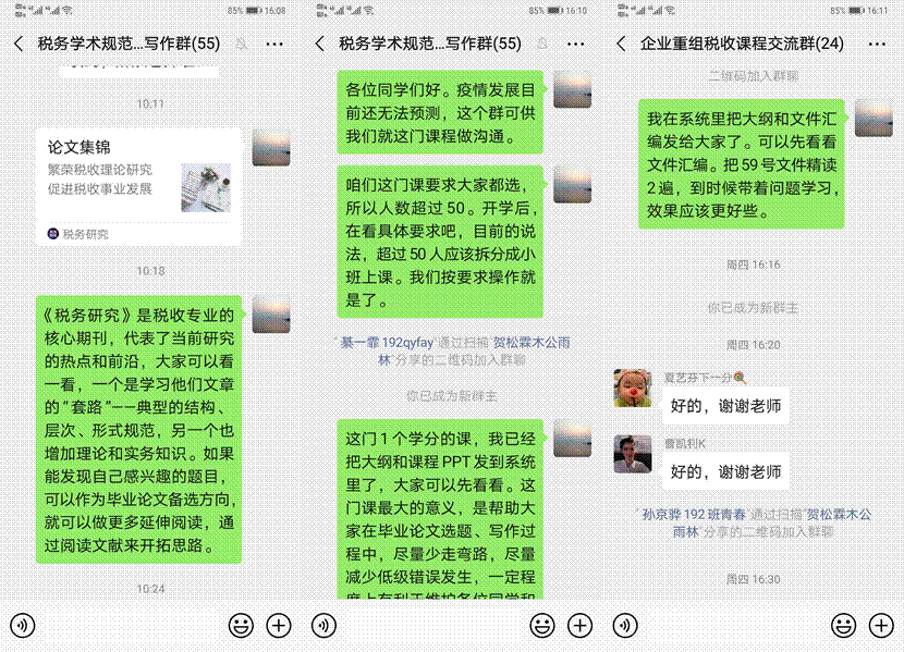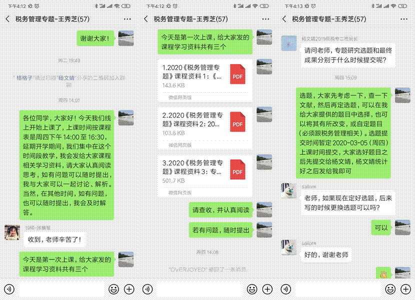 在“税务管理”重点课程线上教学中,任课老师将教学、讨论和问题解析集中在课程表规定的上课时段,并按课节发放学习资料,随时解答同学们提出的问题;同时,课程要求的专题研究报告的选题和撰写工作也在线上稳步进行。任课老师在微信群中详细阐述了报告选题和正文撰写等方面的要求,并对同学的疑问进行了及时、全面的解答。