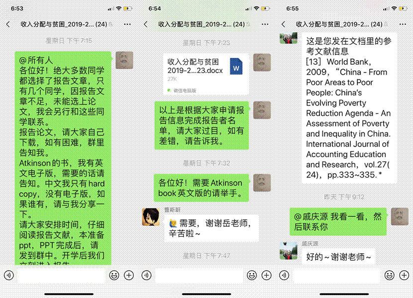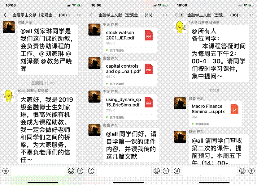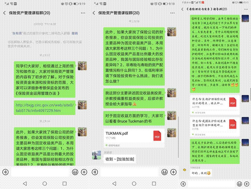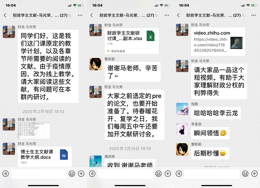 在“财政学主文献阅读”重点课程线上教学中,任课老师在微信群中向同学们分享了大量的相关文献,并引导同学们针对重点章节、根据兴趣和需求选读;通过向同学们分享生动有趣的视频,引导同学在生活其他领域分析和应用财政学相关知识,引起了同学们的热烈反响。