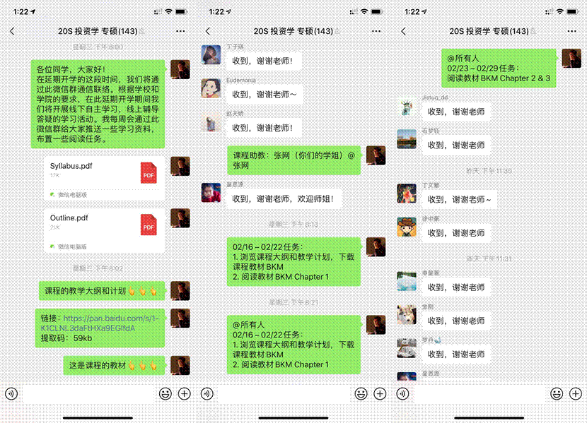 在“投资学”重点课程线上教学中,任课老师每周通过微信群向同学们发布周学习任务、推送学习资料,对教学内容进行了科学、详细的分配。
