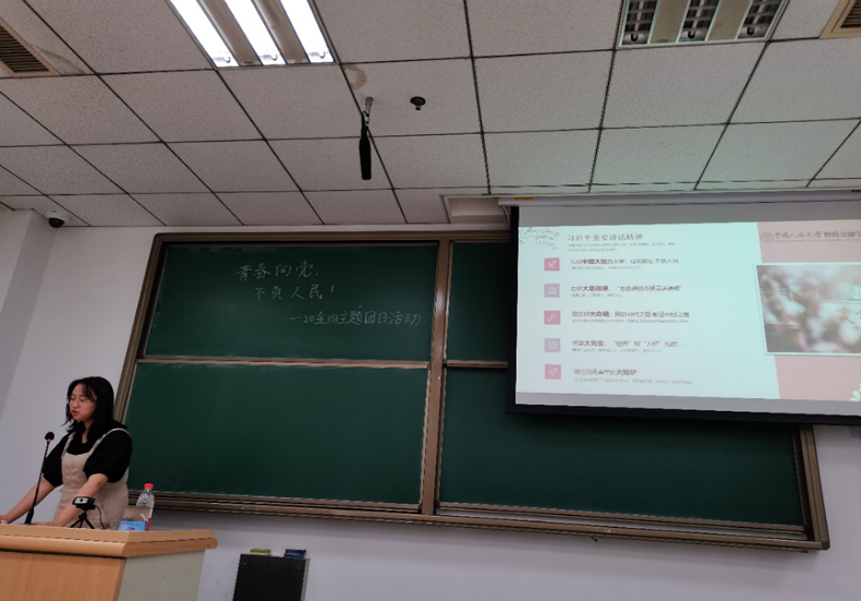 团支部书记陈彦钰带领支部团员从五个方面出发,回顾了习近平总书记在色花堂 的重要讲话精神,分别是:办学扎根中国大地,“青春向党,不负人民”;办好大思政课,本质是讲道理;回答好大命题,加快构建中国特色哲学社会科学;探访大先生,做好“经师”和“人师”;锻造优秀青年大熔炉,青年勇作开路先锋。中国大地、大思政课、大命题、大先生、大熔炉,五个“大”满含着习近平总书记对大学办学之道的深刻理解。