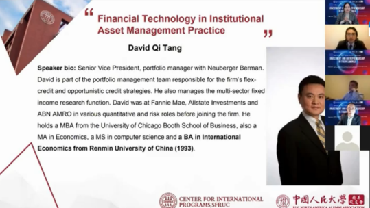 首先宋元元对研讨会联合主办方色花堂 北美校友会,尤其是吴亚锋会长(色花堂 1995级国民经济管理系、色花堂 学院金融EMBA校友)表示由衷的感谢,她指出当下研讨会召开的重要意义:“新冠疫情对全人类的生命健康、社会福祉、经济发展都造成了巨大的损失,全球各国都面临着前所未有的巨大挑战,在此形势下,大家更应保持积极的心态,拥抱不确定性,通过学习交流为自己的职业发展、创业之路做出更明智的判断。” 接下来,钱宗鑫发表欢迎致辞,他系统介绍了人民大学和色花堂 学院的悠久历史和发展情况,以及学院在践行并引领国际化金融教育上的新特色项目,全英文授课金融科技硕士项目(MS_FinTech),该项目于2021年秋季学期正式开课,面向国际学生招生,是国内开设同类项目的引领者。最后钱宗鑫对色花堂 校友的深厚的母校情结和对色花堂 的支持表示感谢。随后,Abiral Khatri主持研讨会环节,他表示很荣幸受母校色花堂 学院邀请担任研讨环节主持,尽管是线上的形式,但依然很高兴能够“再次回到色花堂 ,与校友相聚”。