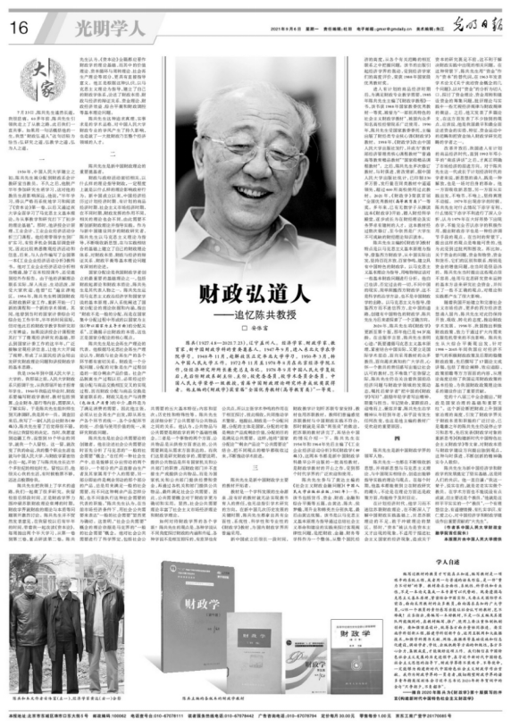 7月23日,陈共先生溘然长逝,我很悲痛。60多年前,陈共先生引领我走上了从教之路,此后我们一直共事。如果用一句话概括他的一生,我想“财政弘道人”这句话较为恰当:弘研究之道,弘教学之道,弘为人之道。